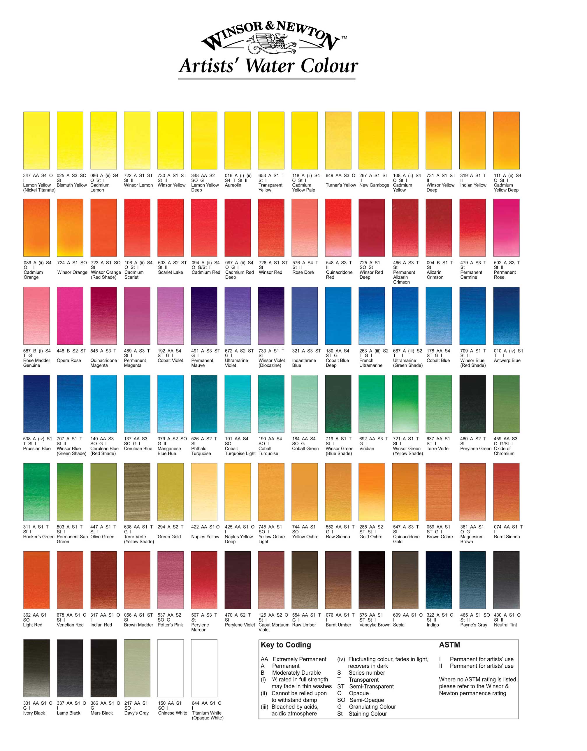 Winsor & Newton Artists watercolours colours chart
